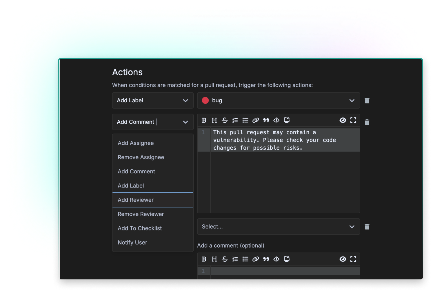 Actions define what happens next, such as adding a comment, applying a label, assigning reviewers, generating an AI PR description, or generating a checklist.